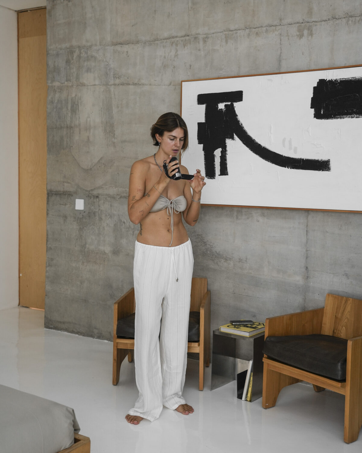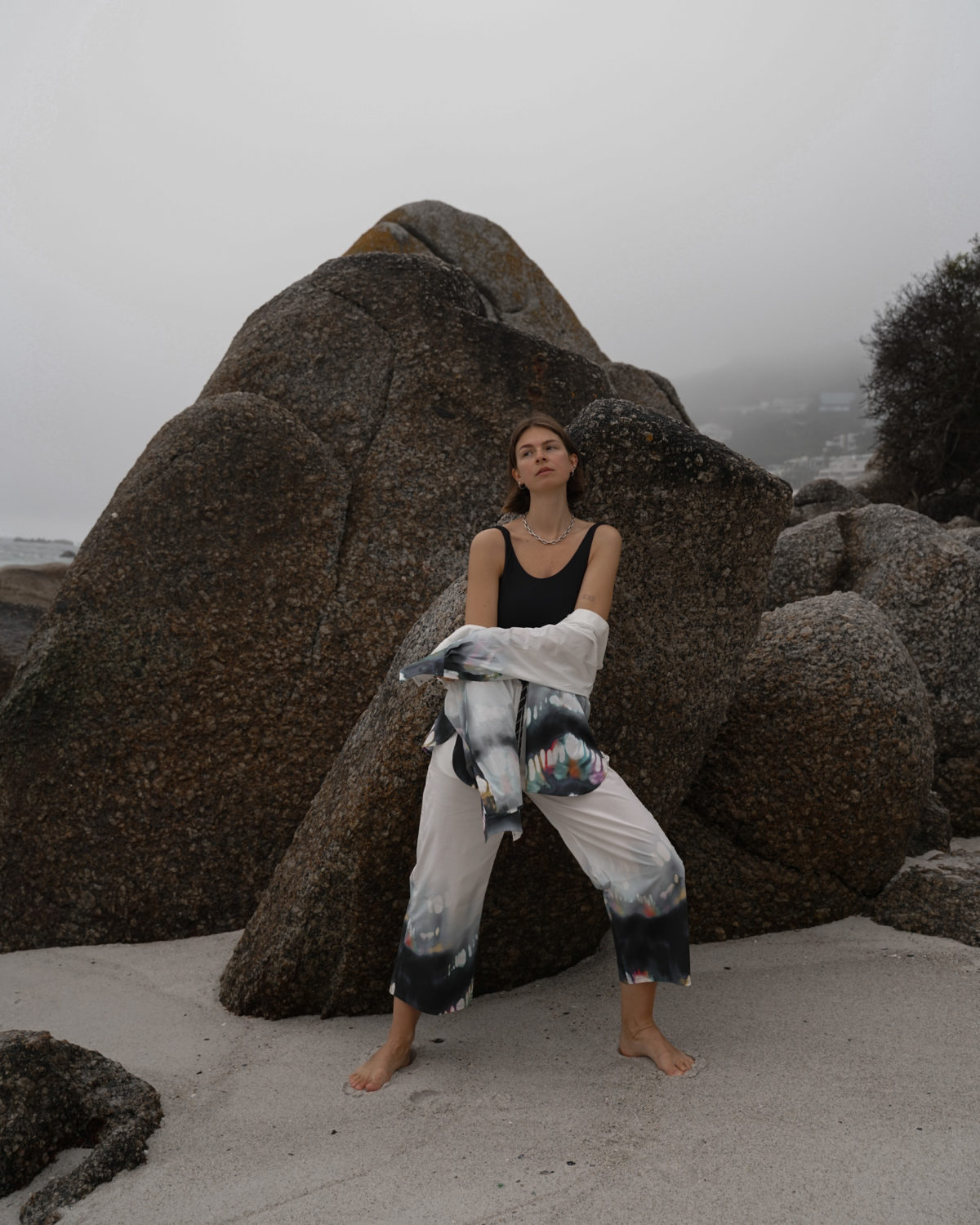 - Der schwarze Badeanzug: Layering mit einer lockeren schwarzen Hose und einem weißen Hemd, dazu chunky Sandalen und minimaler Schmuck.