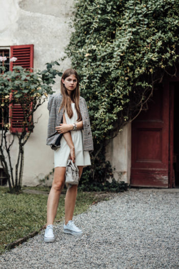 Travel Outfit: white dress, plaid blazer and white platform sneakers