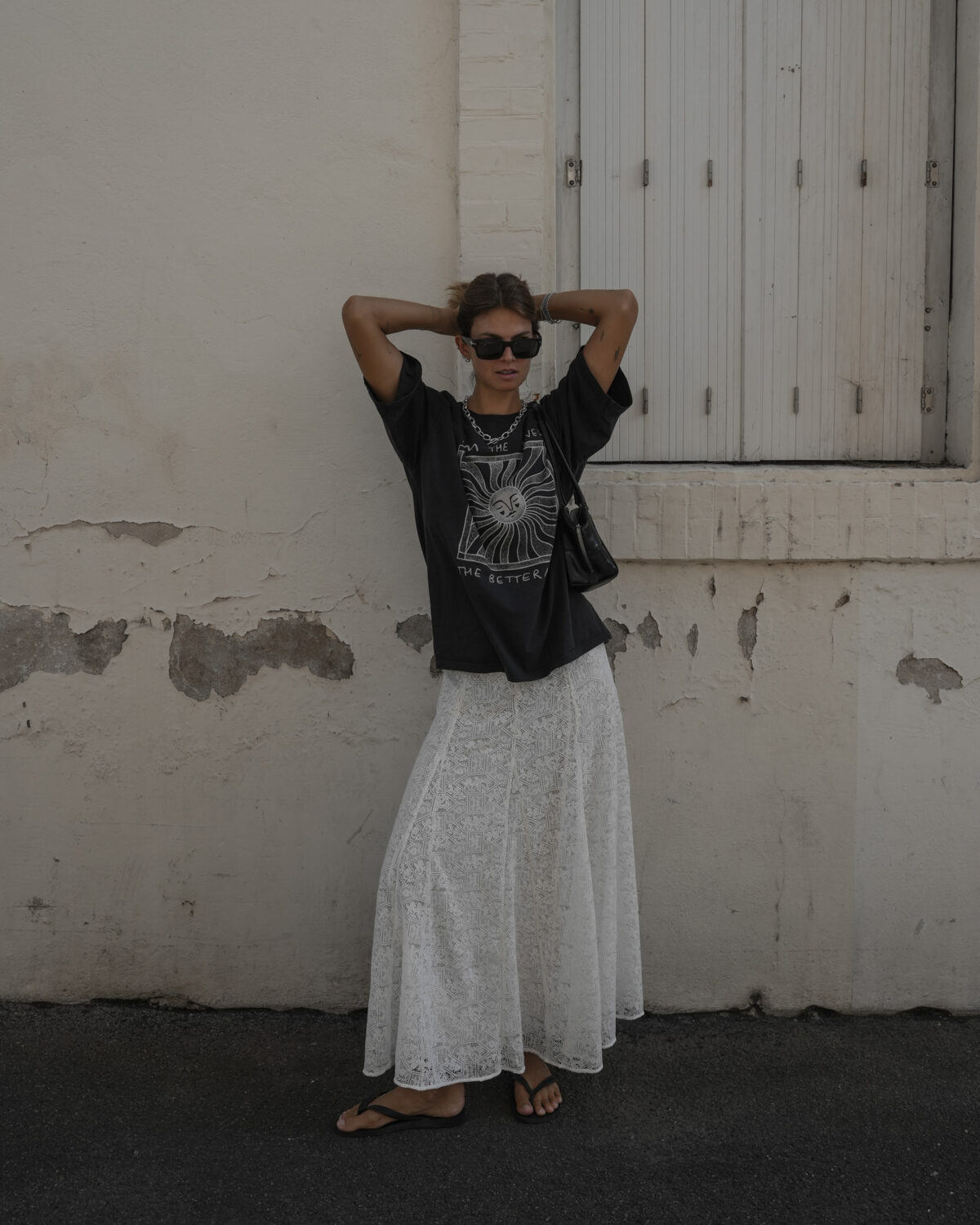 A chiffon or lace slip dress layered over a simple T-shirt instantly makes it feel more casual and takes away any “lingerie” vibe. On cooler days, slip dress layering also works with a sweater and/or pants underneath—feminine, effortless, and surprisingly easy.