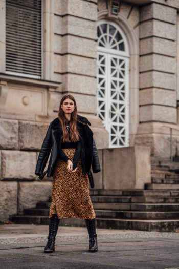 Winteroutfit mit Midirock, Shearling Jacke und Lederstiefeln