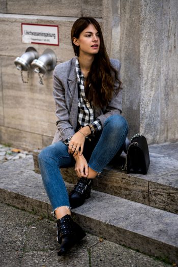 Karohemd, Blazer und Denim miteinander kombiniert