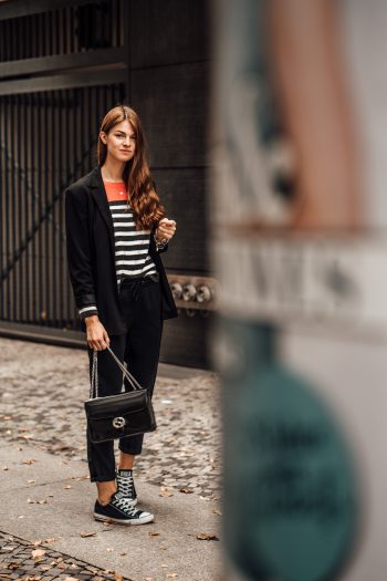 So trägt man Casual Schick: Gestreifter Pullover und schwarzer Blazer
