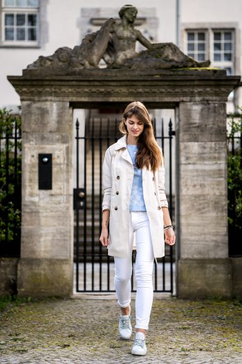 Trenchcoat, weiße Jeans und Top mit Blumenstickerei